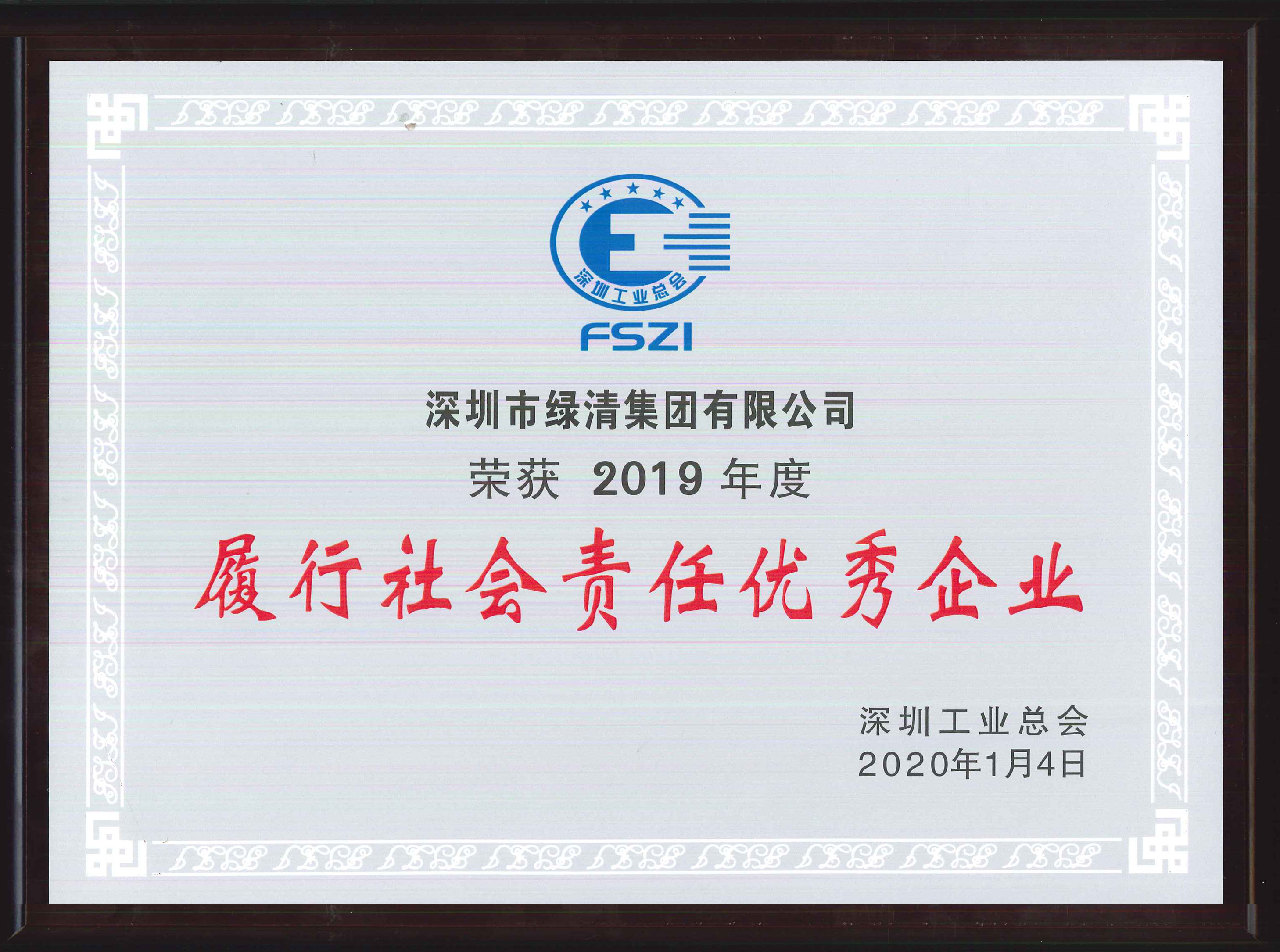 本次會議旨在通過表彰履約社會責任企業、工匠培育示范單位等一批優秀企業,推動深圳市企業自主創新、品牌建設、質量強市、弘揚工匠精神、履行社會責任,樹立了學習標桿。深圳市綠清集團有限公司憑借在物業行業的專業服務、優秀的市場口碑以及在社會公益方面的突出貢獻,榮獲2019年度深圳市工業總會”履行社會責任獎”。