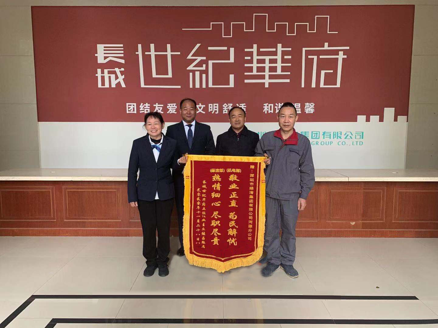 在11月28日,長城世紀(jì)華府的業(yè)主拿著寫有“敬業(yè)正直 為民解憂 熱情細(xì)心 盡職盡責(zé)”的錦旗來到物業(yè)服務(wù)中心,表達(dá)對綠清集團(tuán)河源分公司物業(yè)管家的感激之情。