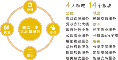 綠清戰(zhàn)略推進(jìn)“大物業(yè)”“大后勤”服務(wù),深度融入“大格局”,構(gòu)建公建、軌交、商企、安保“四位一體、大后勤服務(wù)”的多業(yè)態(tài)協(xié)同戰(zhàn)略。業(yè)務(wù)涉及:市政管理、黨政辦公大樓、政府外包業(yè)務(wù)、公園、展館、學(xué)校、醫(yī)院、機(jī)關(guān)食堂,以及軌道交通、住宅物業(yè)、科技園區(qū)、寫字樓、安保服務(wù)等諸多領(lǐng)域,為美好生活提供一站式大后勤服務(wù)保障。