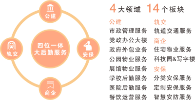 綠清戰略推進“大物業”“大后勤”服務,深度融入“大格局”,構建公建、軌交、商企、安保“四位一體、大后勤服務”的多業態協同戰略。業務涉及:市政管理、黨政辦公大樓、政府外包業務、公園、展館、學校、醫院、機關食堂,以及軌道交通、住宅物業、科技園區、寫字樓、安保服務等諸多領域,為美好生活提供一站式大后勤服務保障。