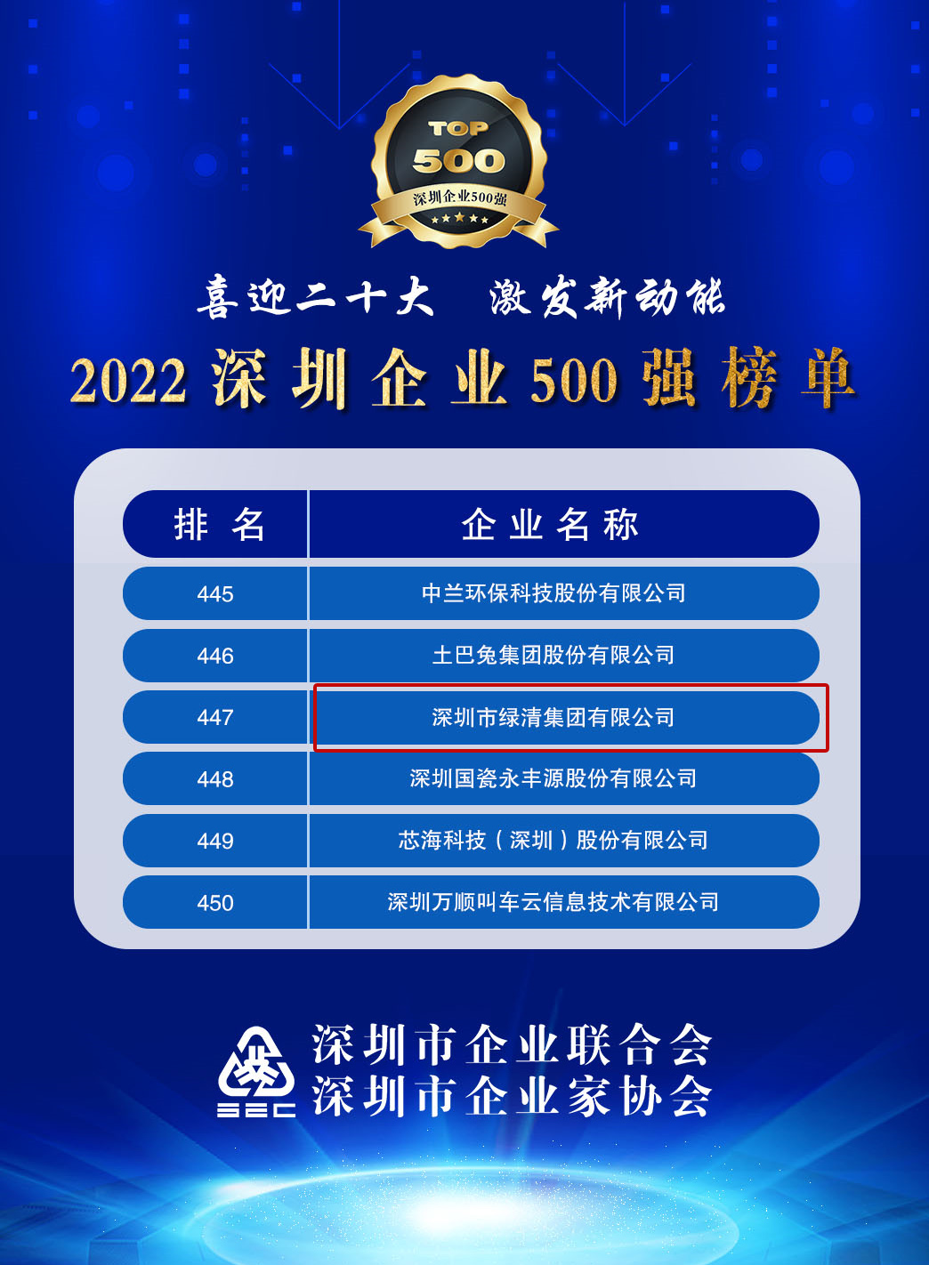 綠清生活服務深圳有限公司(工商更名前為:深圳市綠清集團有限公司,以下簡稱:綠清服務)憑借穩健的規模實力、出色的發展成績,成功躋身深圳企業500強榜單!
