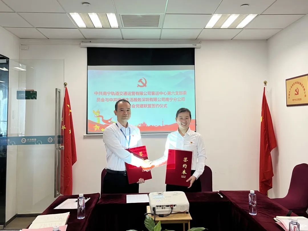 為進一步加強基層黨組織和黨員隊伍建設,不斷增強黨組織的凝聚力和戰斗力,日前,中共綠清生活服務深圳有限公司南寧分公司支部委員會(下稱綠清南寧分公司黨支部)與中共南寧軌道交通運營有限公司客運中心第六支部委員會舉行了黨建聯盟簽約儀式,雙方商定共同開展黨建工作,形成優勢互補、資源共享、服務雙向、共建互助的合力,推動黨建與生產經營深度融合,不斷推動公司高質量發展。