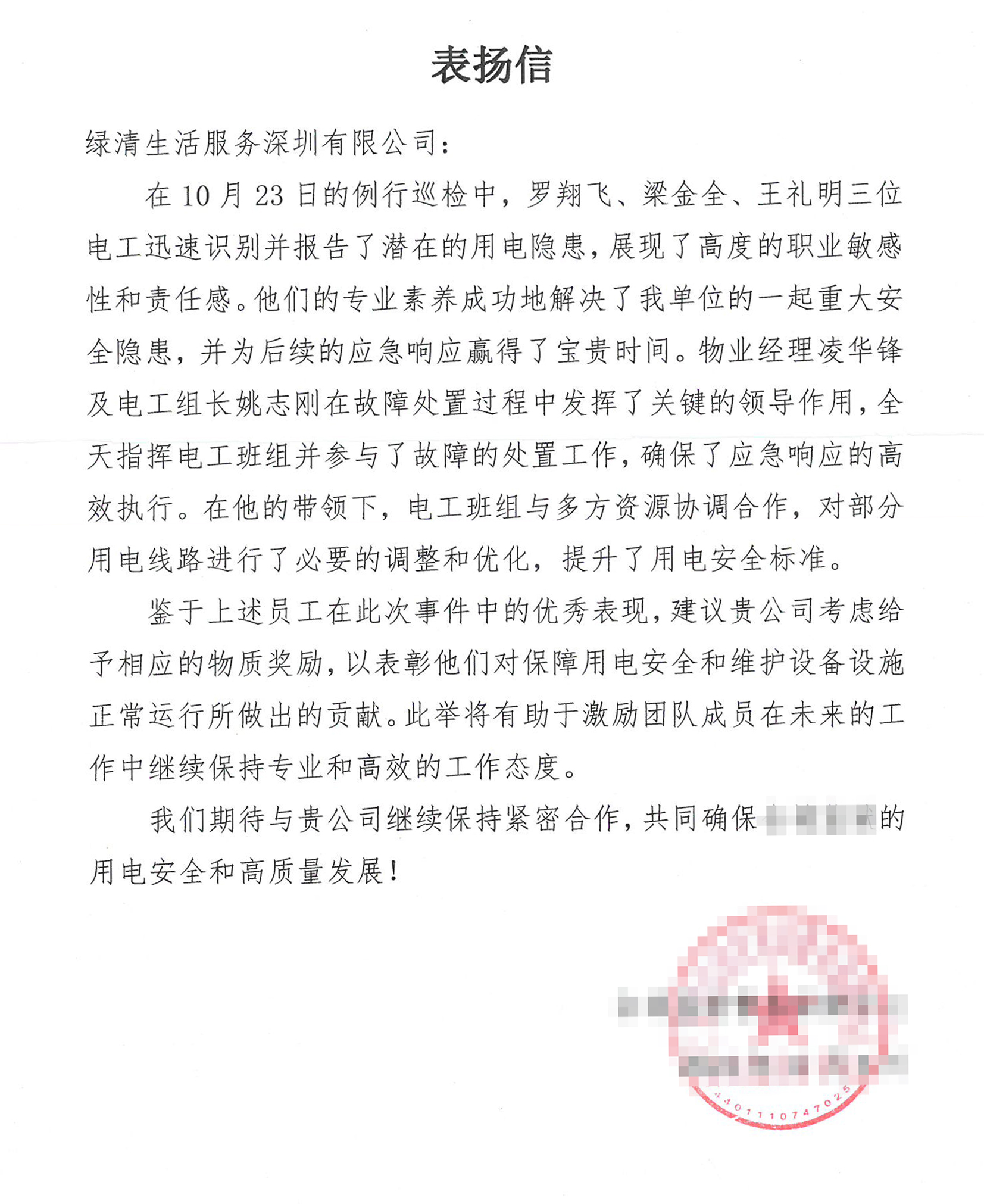 綠清服務相信,只有不斷加強員工隊伍建設,提升員工的專業素養和責任意識,才能夠更好地保障企業的安全發展。在獲得業主單位的嘉獎的同時,綠清服務還對項目電工團隊進行了表彰和獎勵,以激勵更多的員工在未來的工作中繼續保持專業和高效的工作態度。