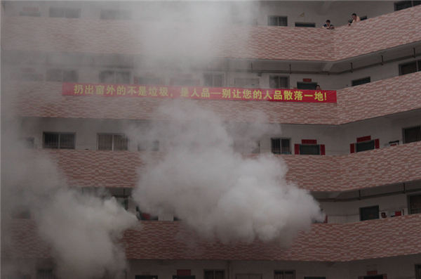 14點30分,環(huán)衛(wèi)公寓一號樓突然濃煙滾滾、煙霧彌漫,此時,拉響了消防疏散的警報聲。緊接著,在綠清消防逃生組的帶領(lǐng)下,居民們貓著腰有序地前行,穿過走廊,通過樓梯,迅速跑向操場。