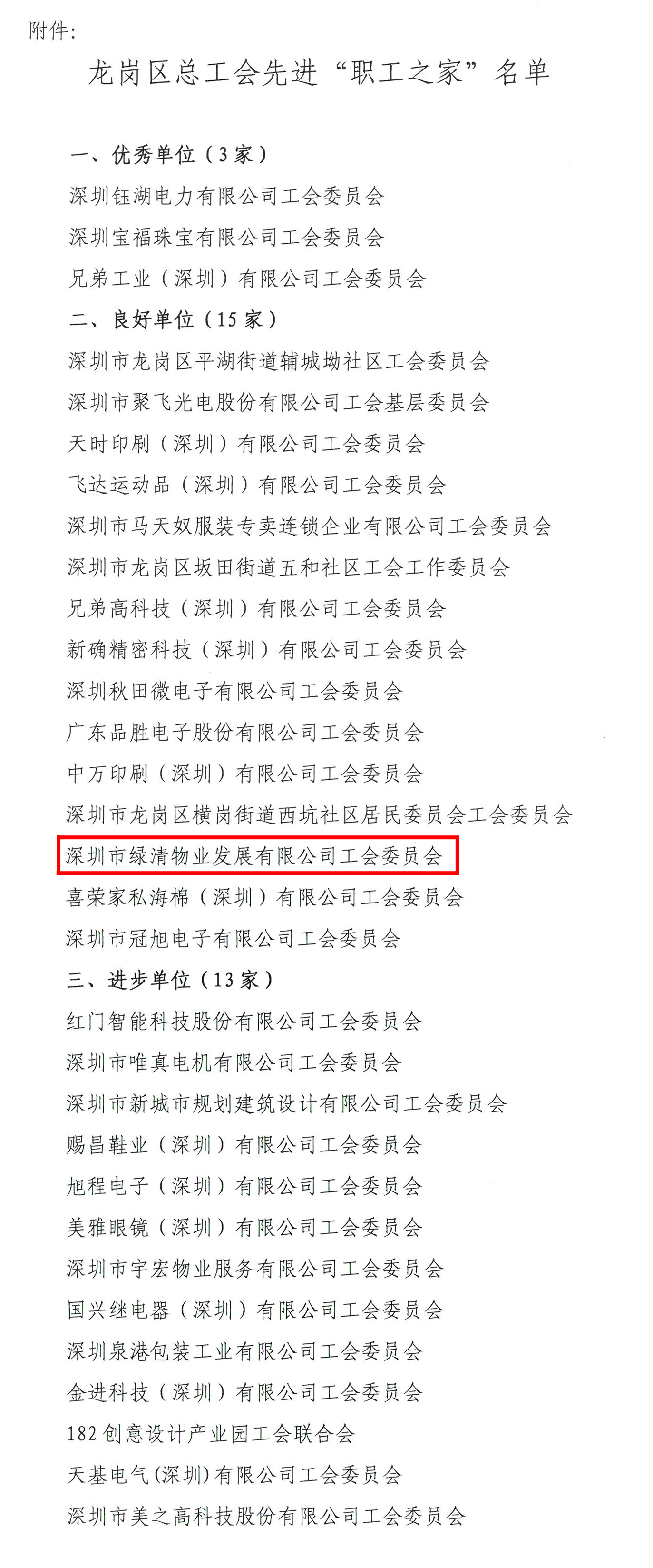 近日,深圳市綠清物業發展有限公司工會委員會獲得由市總工會頒發的“2016年龍崗區先進職工之家”榮譽,這一榮譽的獲得,是深圳市總工會對綠清工會工作的認可,綠清工會將繼續傾聽群眾呼聲,聚合員工力量,做廣大綠清人的貼心小棉襖。
