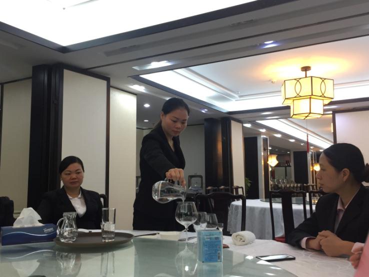 隨后,全體綠清人各就各位,參與餐飲服務模擬現場。譚老師現場指導并示范服務禮儀,對餐飲服務的細節要求進行了詳細的“手把手教學”。