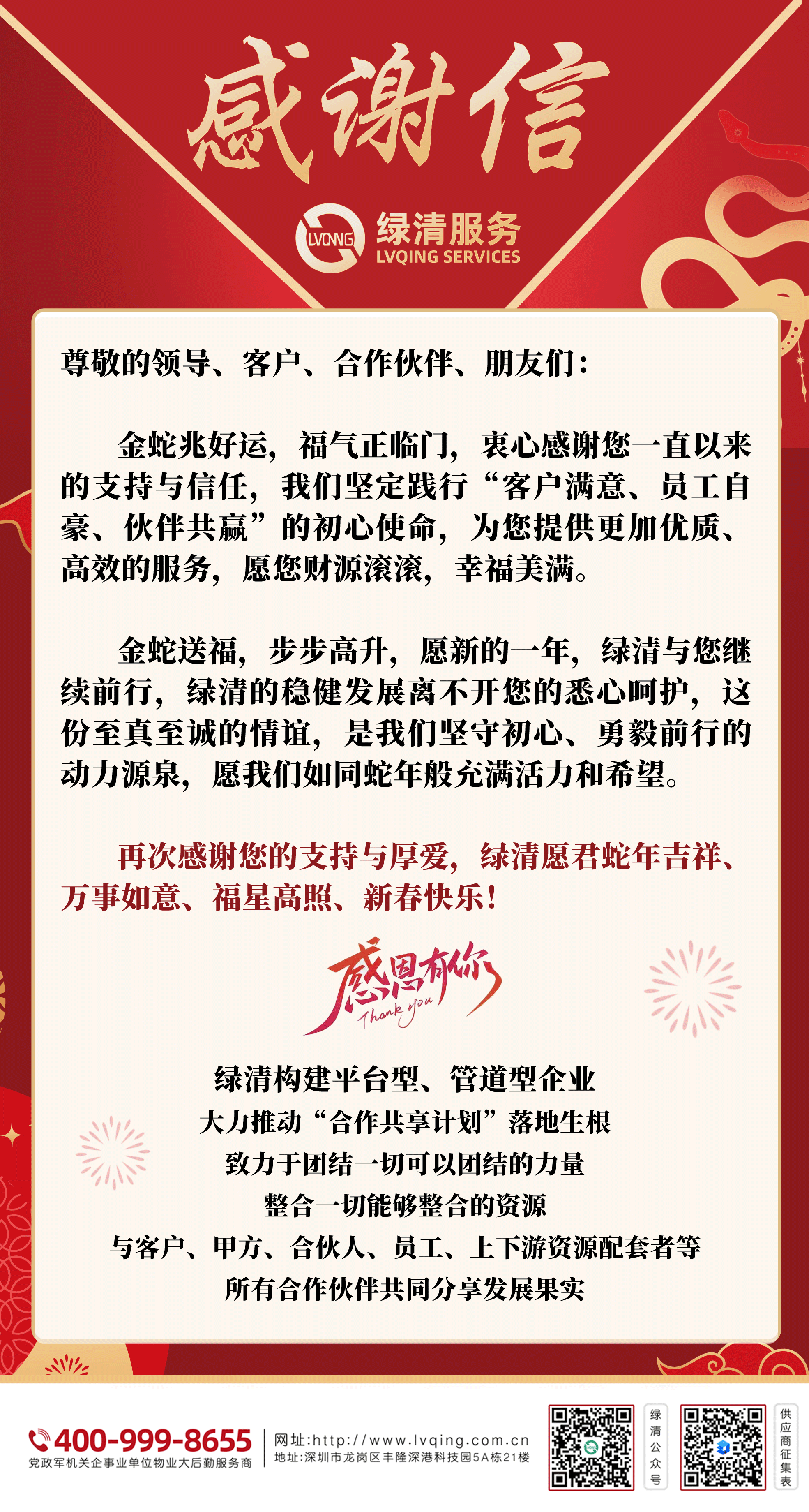 2025-02-05萬物迎春送寒冬, 一年結局在今宵。 生盆火烈轟鳴竹, 守歲筵開聽頌椒。 綠清祝大家蛇年吉祥! 龍年除夕鐘聲即將敲響 我們迎來了充滿希望的蛇年春節 在此,綠清服務向一直以來 給予我們支持與厚愛的 領導、客戶、甲...