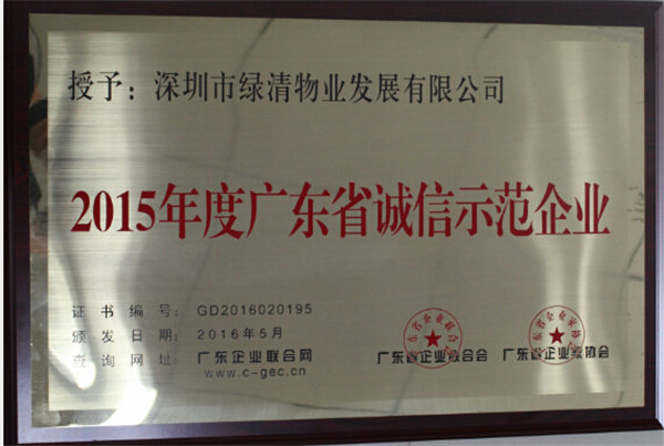 2016-07-20綠清物業被評為“2015年度廣東省誠信示范單位”。綠清為商,恪守誠信。虔誠對待客戶,以誠信立企、興企、強企。綠清物業,值得您信賴的城市大管家。