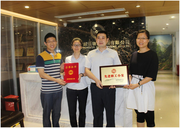 2016-07-202016年5月27日下午,愛聯社區黨委副書記、工會主席陳敏英,副主席丘行先為綠清物業工會委員會頒發“2016年度先進職工小家”的牌匾。 在繽紛世紀大廈31樓黨群活動室,我司領導介紹了綠清人的工作、生活情況,龍城街道兩新黨...