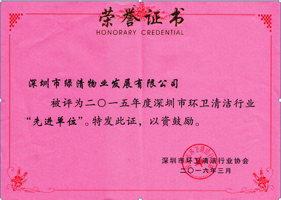2016-07-202016年3月,綠清物業被評為“2015年度深圳市環衛清潔行業先進單位”,這一榮耀的取得是全體綠清人共同努力的收獲。面對這樣的榮譽我們將繼續堅持“規范、精細、創新、和諧”的服務理念,繼續為客戶提供專業優質的服務。