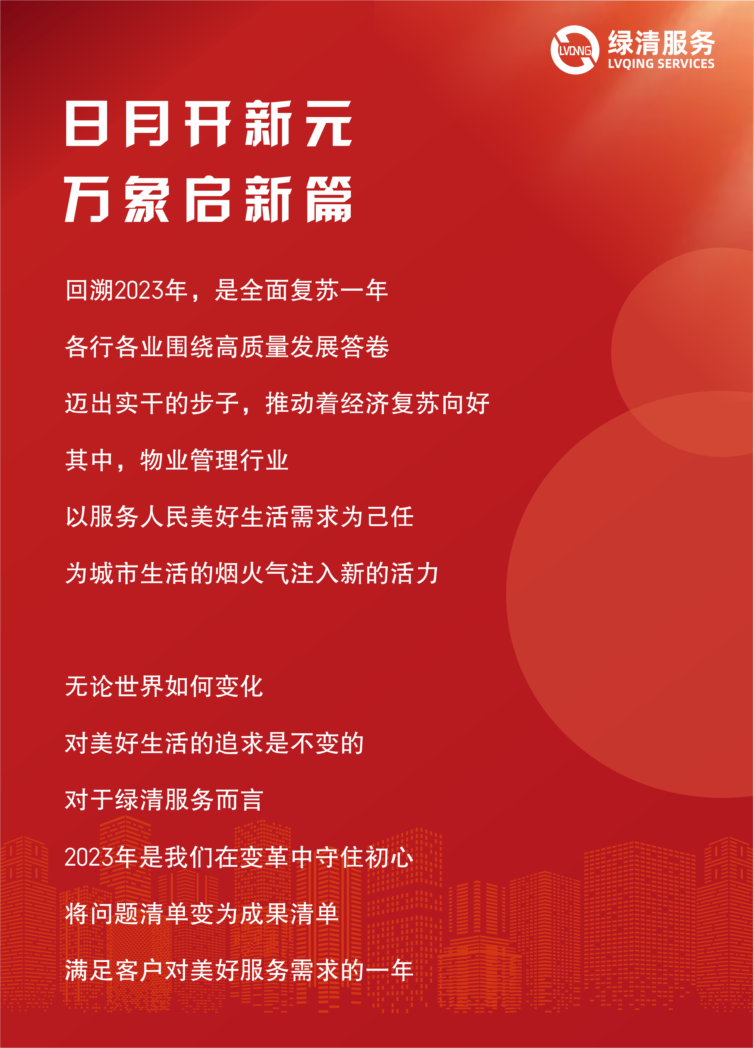 2024-02-02回望2023 綠清服務扎根黨政軍機關企事業單位物業大后勤服務領域,業務遍布全國50多座城市,呈現百花齊放的繁榮景象。 展望2024 綠清服務堅持踐行“讓客戶滿意”的企業使命,以追光者、奮斗者的姿態,篤定前行,成就不凡,再待...