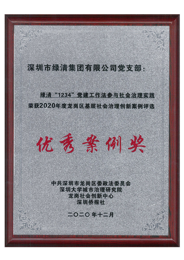 2020年12月17日,綠清集團(tuán)受邀參加“龍崗區(qū)基層社會(huì)治理創(chuàng)新案例”頒獎(jiǎng)儀式,該儀式由中共深圳市委政法委員會(huì)指導(dǎo),中共深圳市龍崗區(qū)委政法委員會(huì)聯(lián)合深圳大學(xué)城市治理研究院、深圳僑報(bào)社、龍崗社會(huì)創(chuàng)新中心舉辦。