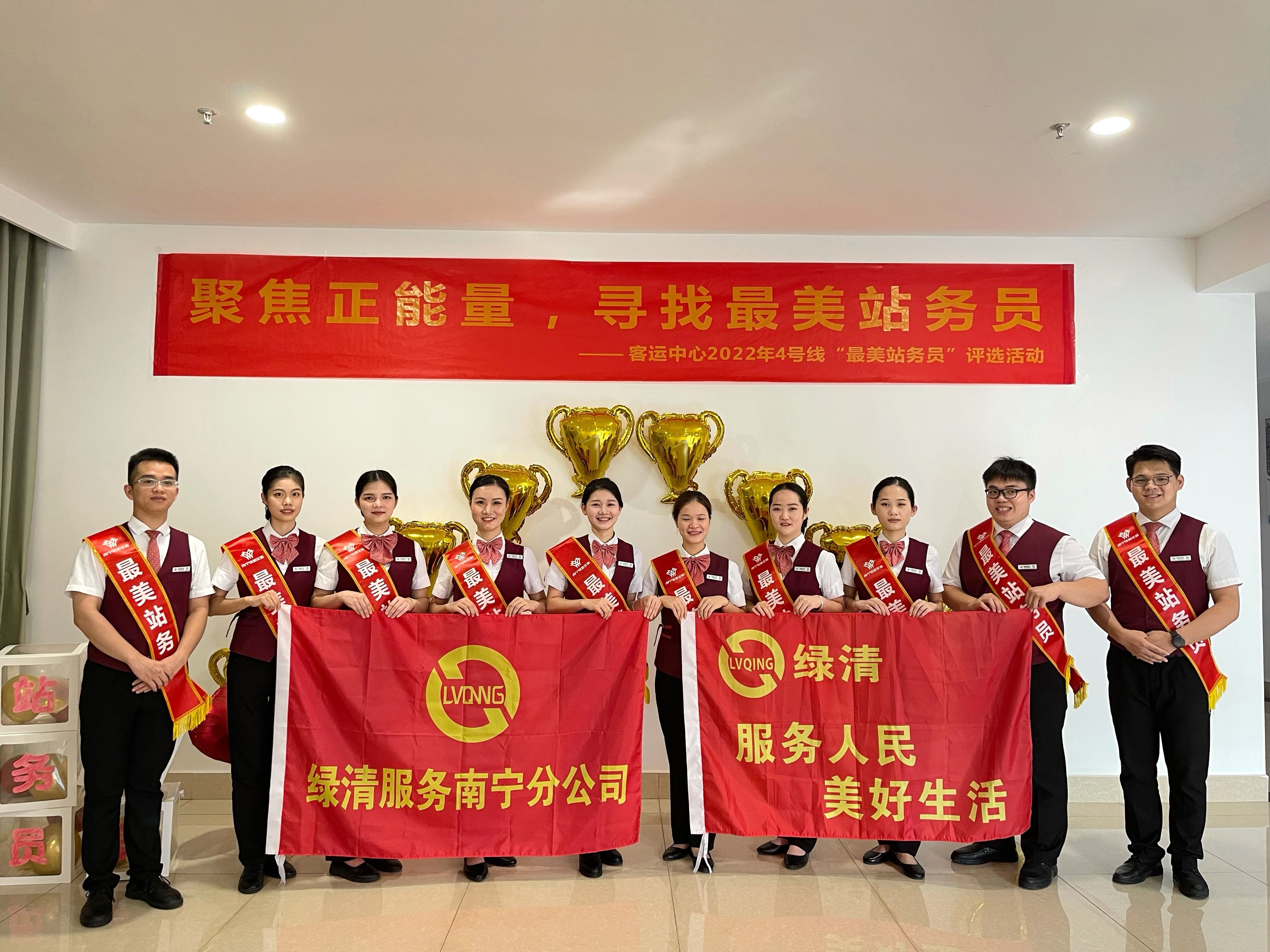 國慶節(jié)前,綠清服南寧分公司南寧地鐵四號線項(xiàng)目部喜訊頻傳,10名站務(wù)員因表現(xiàn)突出,被南寧軌道交通集團(tuán)授予“最美站務(wù)員”稱號,以優(yōu)異成績?yōu)楣埠蛧鴩鴳c、黨的二十大獻(xiàn)禮。