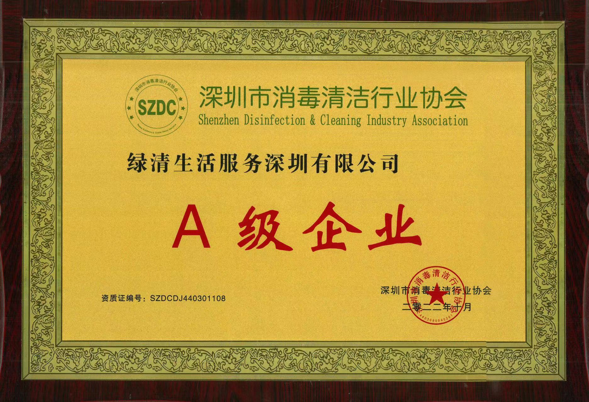深圳市消毒清潔行業協會A級企業